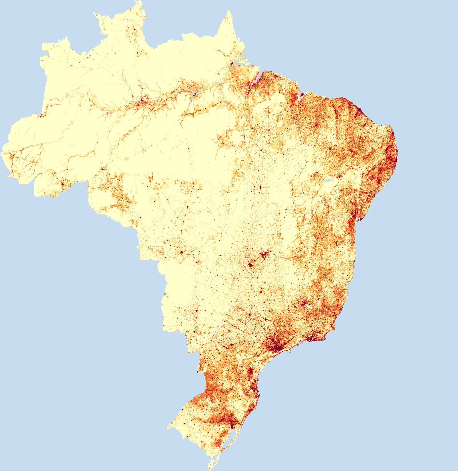 Population density map of Brazil showing the distribution of people per square kilometer. View all Brazil statistics →