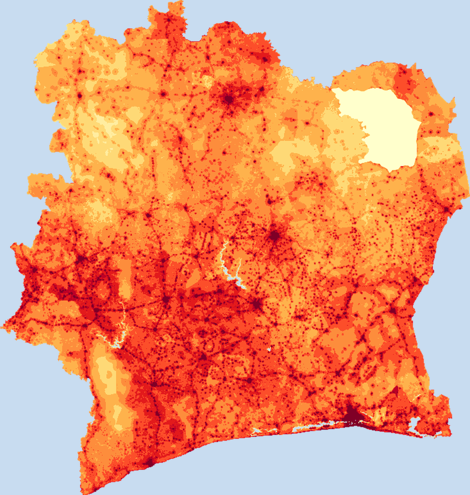 Population density map of Cote d'Ivoire showing the distribution of people per square kilometer. View all Cote d'Ivoire statistics →
