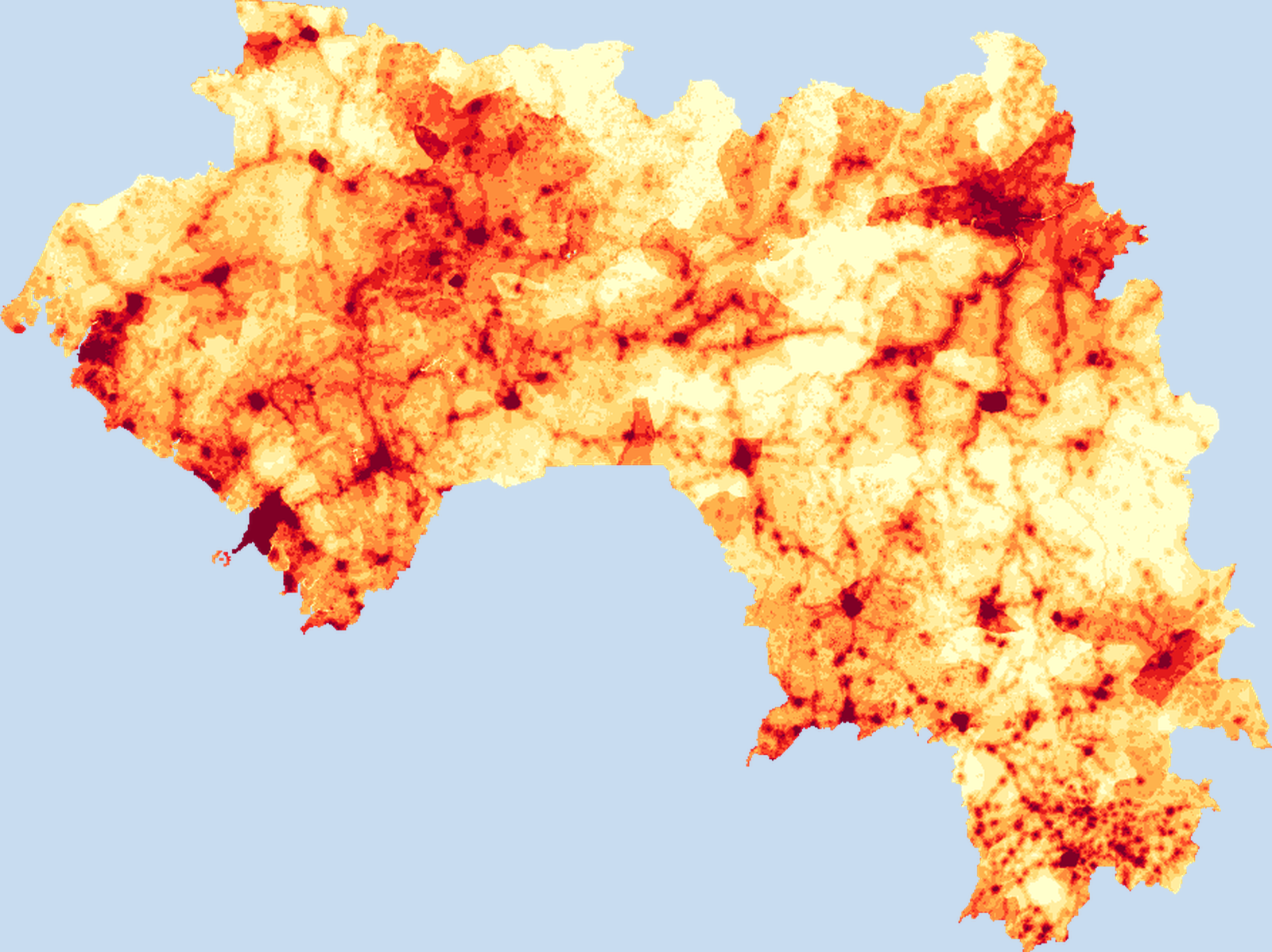 Population density map of Guinea showing the distribution of people per square kilometer. View all Guinea statistics →