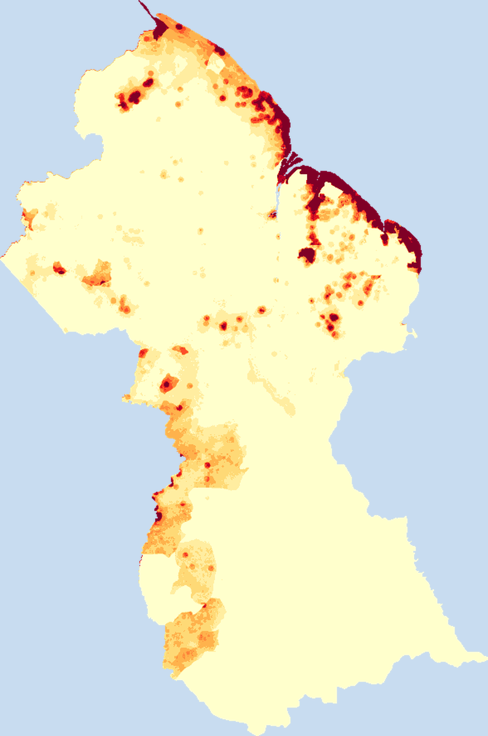 Population density map of Guyana showing the distribution of people per square kilometer. View all Guyana statistics →