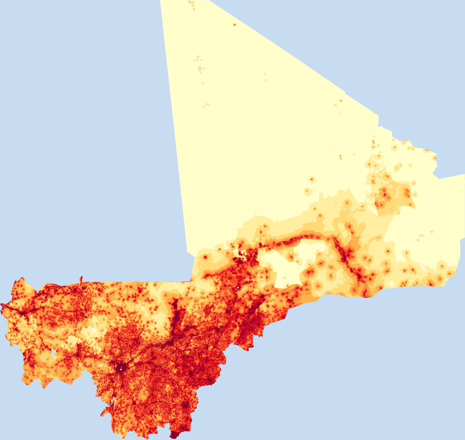 Population density map of Mali showing the distribution of people per square kilometer. View all Mali statistics →