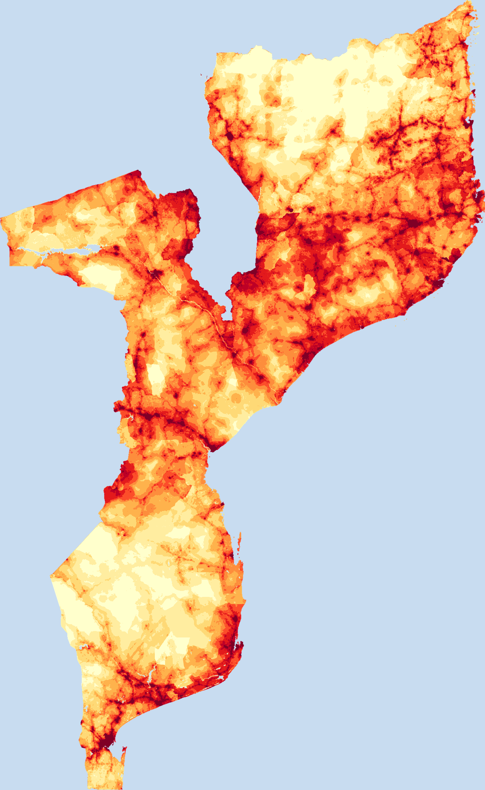 Population density map of Mozambique showing the distribution of people per square kilometer. View all Mozambique statistics →