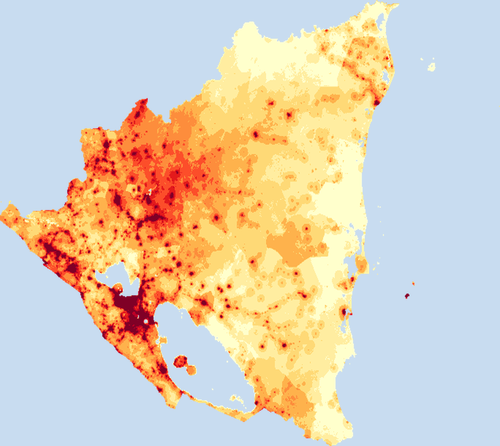 Population density map of Nicaragua showing the distribution of people per square kilometer. View all Nicaragua statistics →
