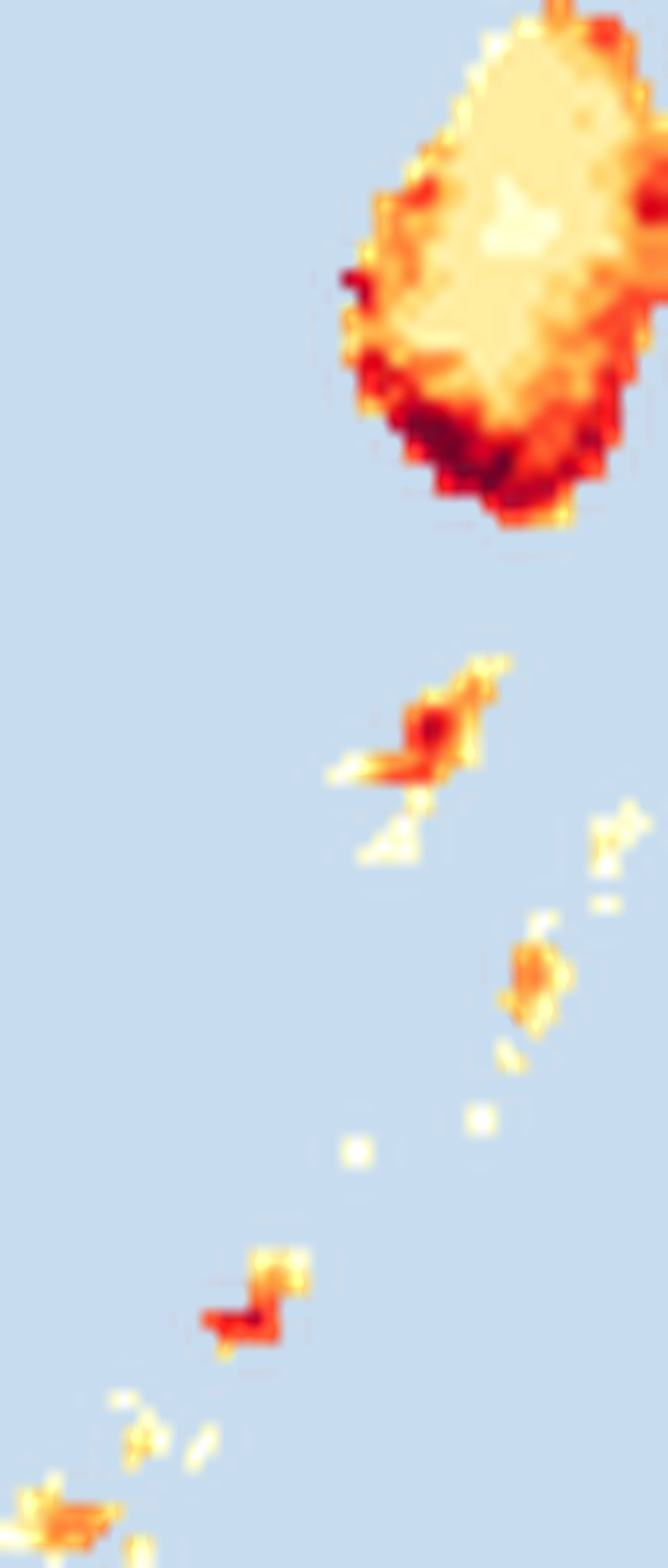 Population density map of St. Vincent and the Grenadines showing the distribution of people per square kilometer. View all St. Vincent and the Grenadines statistics →
