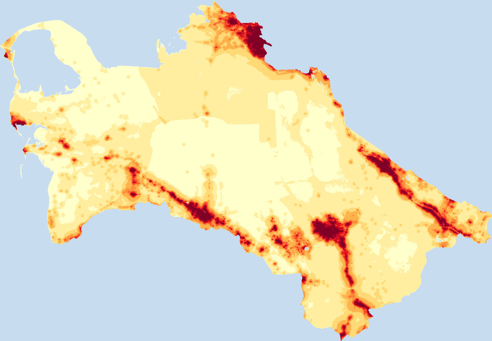 Population density map of Turkmenistan showing the distribution of people per square kilometer. View all Turkmenistan statistics →
