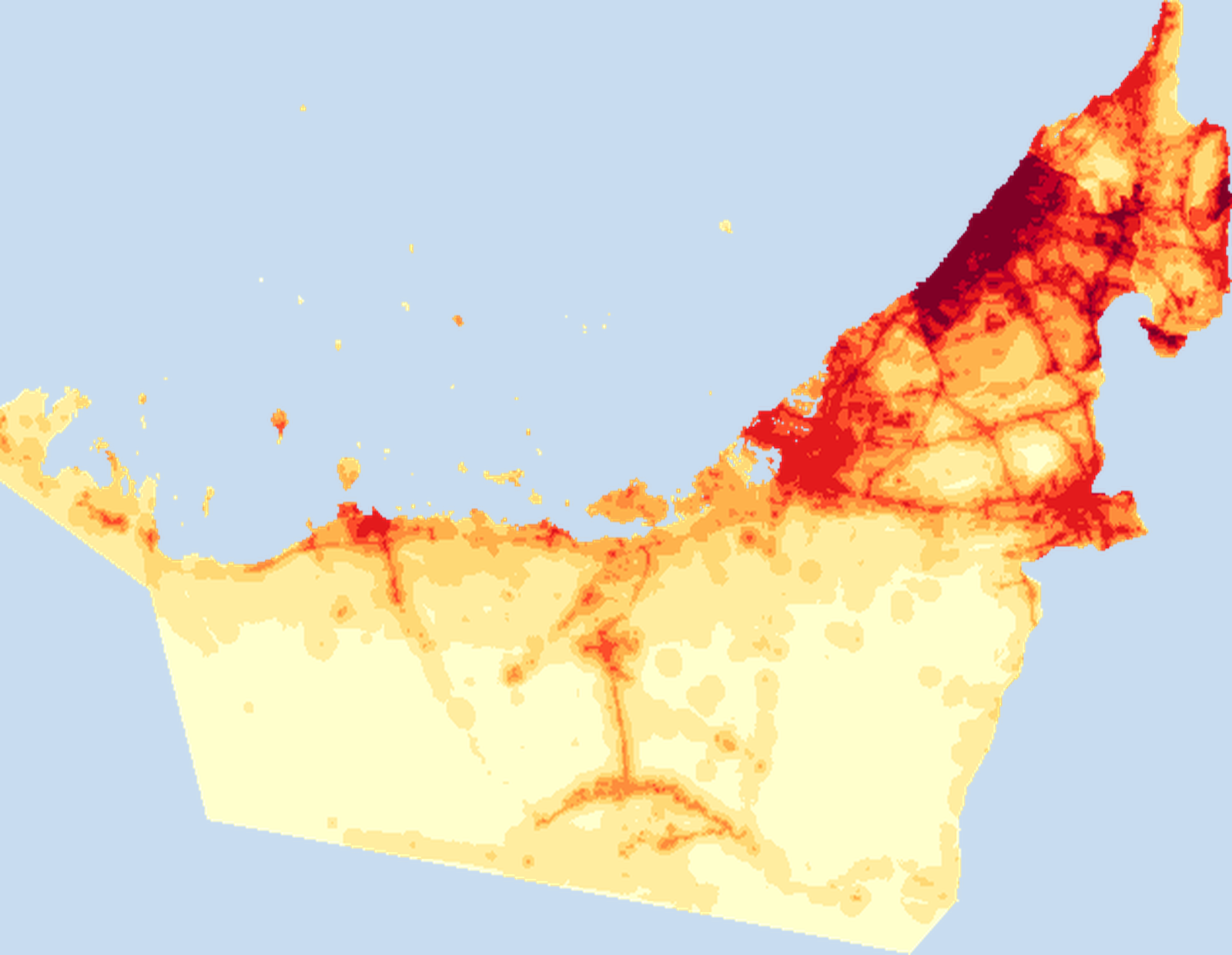 Population density map of United Arab Emirates showing the distribution of people per square kilometer. View all United Arab Emirates statistics →