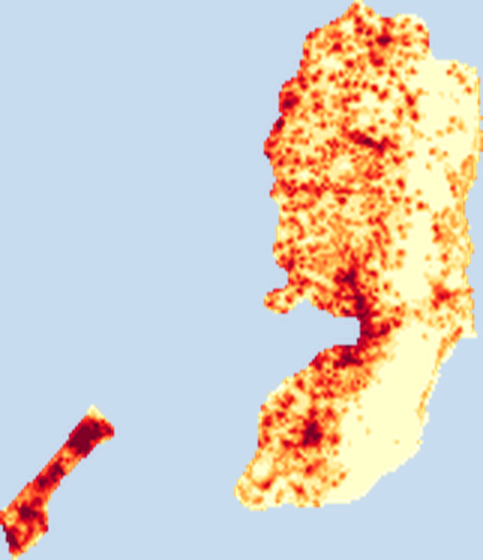 Population density map of West Bank and Gaza showing the distribution of people per square kilometer. View all West Bank and Gaza statistics →