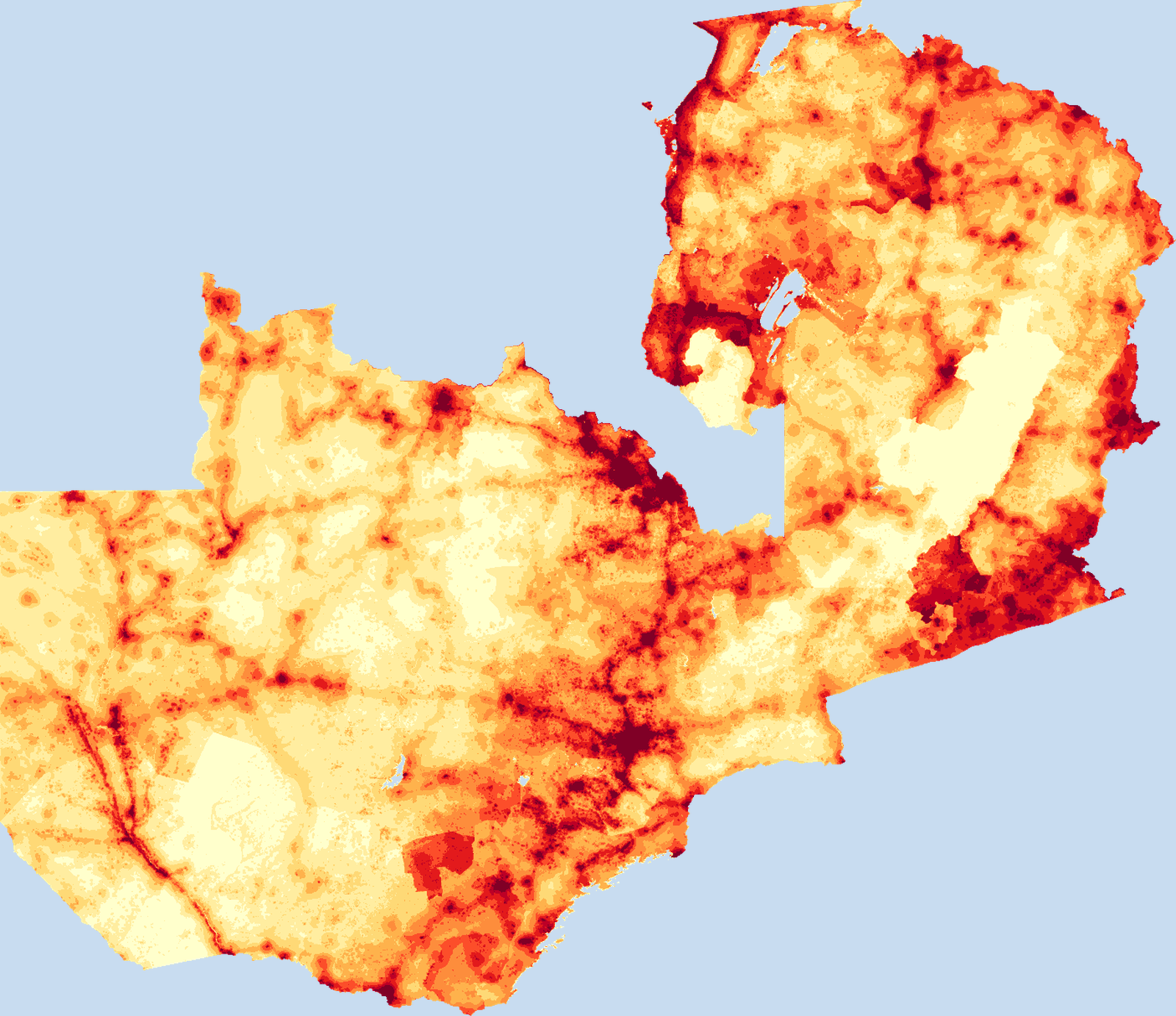 Population density map of Zambia showing the distribution of people per square kilometer. View all Zambia statistics →